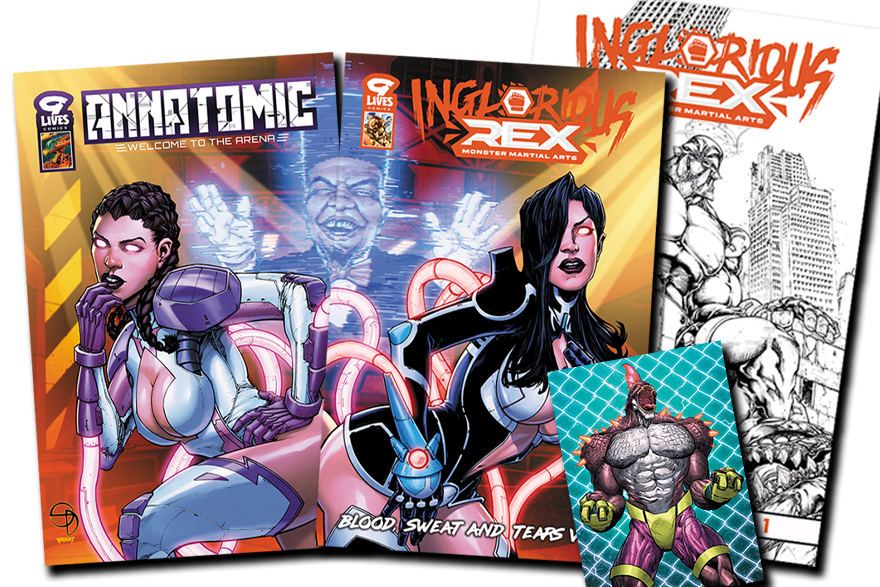 (1) Annatomic: Welcome to the Arena A2A Cover PLUS (1) Supplemental Book Vol 4 A2A Cover PLUS (1) Inglorious Rex Line Art Hardcover Edition Vol 1. Your books will be bagged and boarded, then shipped in a Gemini mailer.