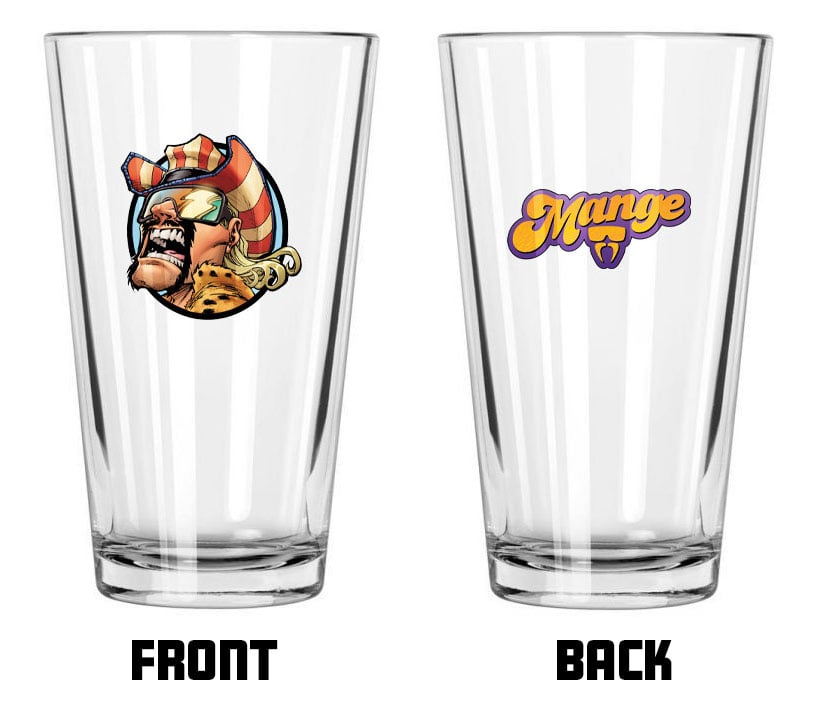 (1) Mange Davis 16oz pint glass. An image of Mange will be printed on the front of the glass and the Mange logo will be on the back.