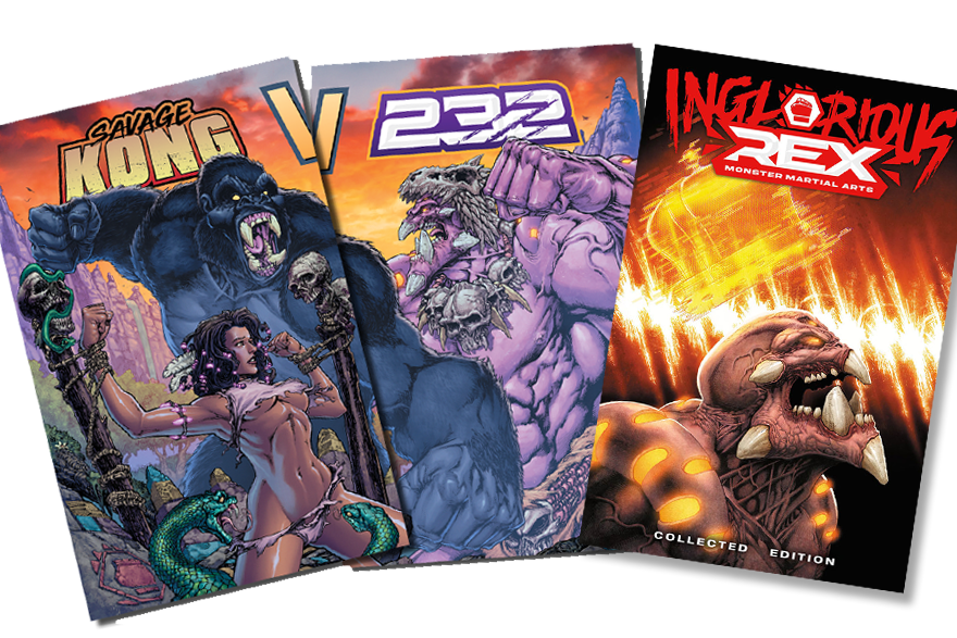 (1) Inglorious Rex Vol 3 Savage Kong VS 232 Cover PLUS (1) Inglorious Rex Vol 3 Savage Kong VS 232 Supplemental Book Vol 3 PLUS (1) Inglorious Rex 232 Beast Mode Aaron Alfeche cover comic book PLUS (1) Inglorious Rex Vol 1 and 2 Collected Trade Edition. Your book will be bagged and boarded, then shipped in a Gemini mailer.